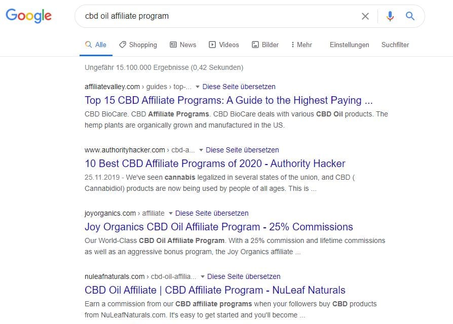 Wenn Du nun lukrative Partnerprogramme in Deiner Nische finden willst, suche einfach mit dem folgenden Operator, mit dem Beispiel CBD: