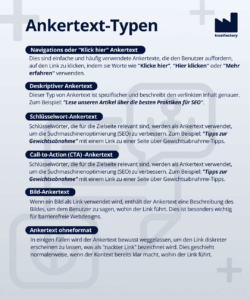 Generische Ankertexte wiederum bestehen aus allgemeinen Wörtern wie “zur Website” oder einer Handlungsaufforderung wie “hier klicken”. Sie lassen nicht auf den Inhalt schließen.