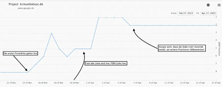 Die Seite https://krinumbelusf.de/, die vor dem Linkbuilding den sechsten Platz belegt hatte, erreichte am 18. April 2023 den ersten Platz. In diesem Kontext ist darauf hinzuweisen, dass es sich um natürliche Verlinkungen und Ankertexte sowie um schwache Links handelte. Deswegen ist nicht auszuschließen, dass Tests in einer komplizierten Umgebung abweichende Ergebnisse bereithalten.