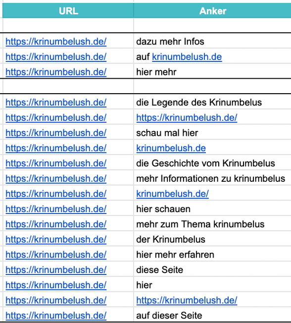 Am 02.03.2023 wurde der Linkplan fertiggestellt. Die gewählten Ankertexte überzeugten durch Natürlichkeit und bestanden zu 25 bis 40 Prozent aus der URL, zu 30 Prozent aus sonstigen Bestandteilen (circa 6 Ankertexte), zu 20 Prozent aus einem Partial Match (circa 3 Ankertexte) und zu 10 bis 15 Prozent aus einem Exact Match (circa 2 Ankertexte).