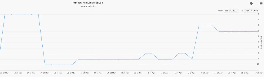 Die Seite https://krinumbelush.de/ positionierte Google zu Beginn der Analyse auf Platz 8. Am 18.04.2023 nahm diese den dritten Platz ein.