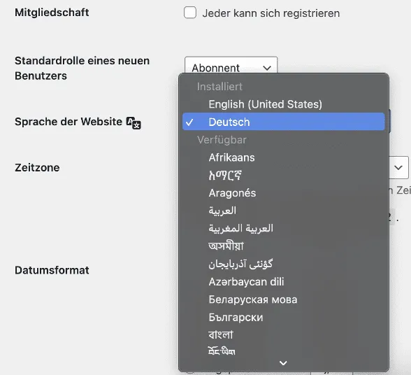 Am 21. Februar 2023 nahm das Team die Grundeinstellungen für die Seiten vor. Im ersten Schritt wurde die Seite auf Deutsch eingestellt.
