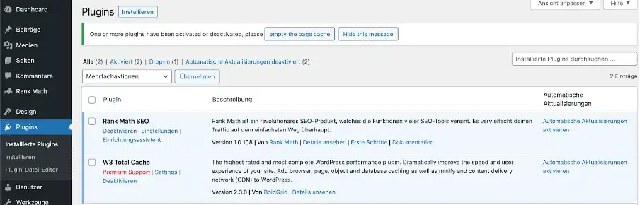 Danach wurden die Plugins überprüft. Plugins, die keine Verwendung fanden, wurden entfernt. Dies betraf nahezu alle Plugins – mit Ausnahme der Plugins W3 Total Cache und Rank Math SEO.
