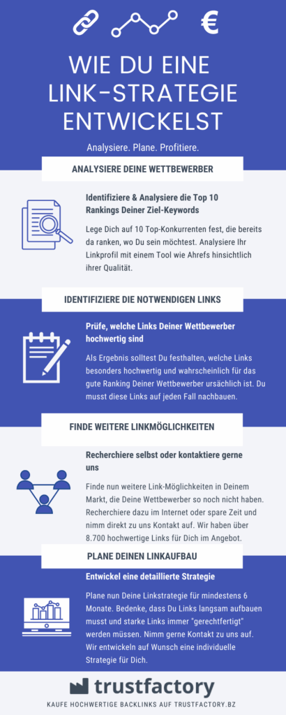 Analysiere dafür Dein Wettbewerbsumfeld, recherchiere manuell oder nimm Kontakt zu Linkbrokern oder Plattformen, wie z.B. Trustfactory auf und erstelle eine Liste.