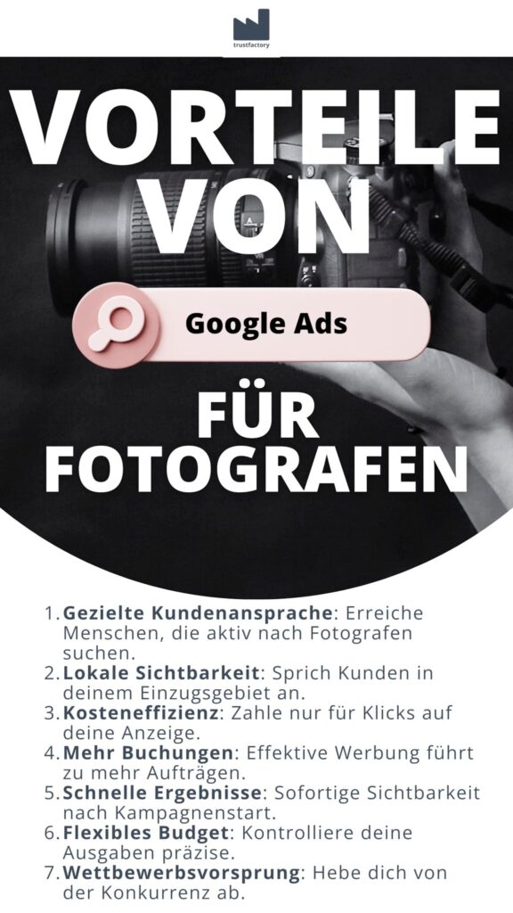 Um das volle Potenzial von Google Ads auszuschöpfen, sind wir bei Trustfactory für dich da. Mit unserer Expertise entwickeln wir maßgeschneiderte Strategien, optimieren deine Kampagnen und sorgen für messbare Ergebnisse. So machen wir Google Ads für dich nicht nur zu einem Marketing-Tool, sondern zu einem echten Wachstumsmotor für dein Fotogeschäft.