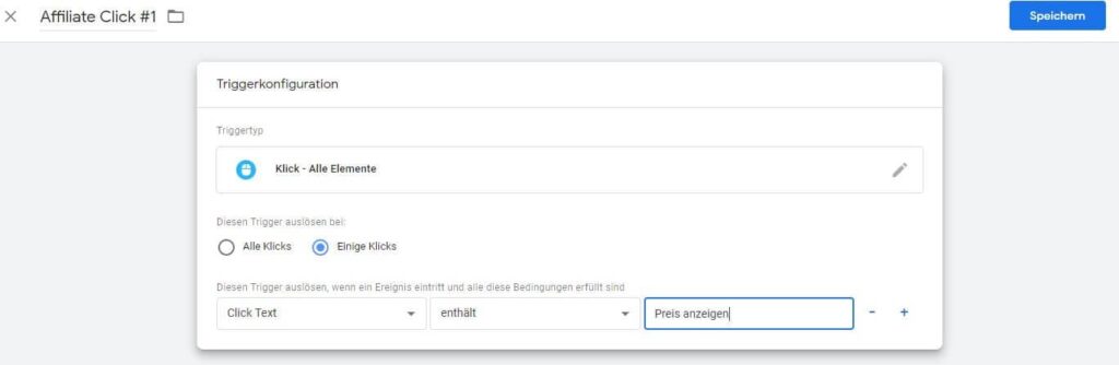 Darunter wählst Du nun die Variable, die Du in Schritt 2.1 hinzugefügt hast. Wir möchten nun den Affiliate-Trigger “Click Text = Preis anzeigen” definieren.