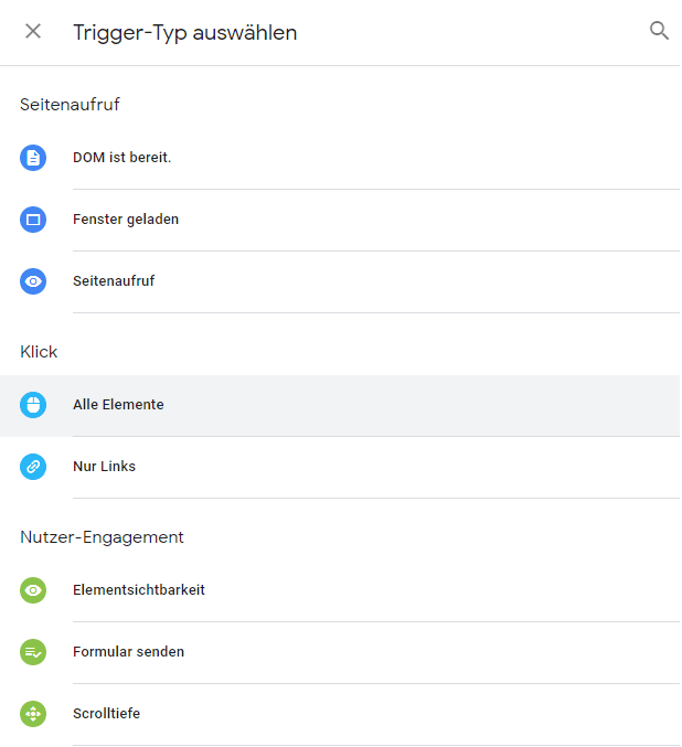 Wähle als Triggertyp wieder “Klick- Alle Elemente”.