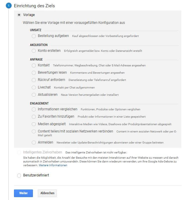 - Ziel: Hier kannst Du etwa den Besucher einer Seite Deiner Website als Ziel definieren.