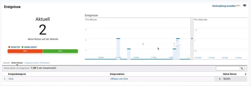 Unter Echtzeit und dann Ereignisse siehst Du beispielsweise, dass unser aktiver Nutzer gerade einen Affiliate-Link angeklickt hat: