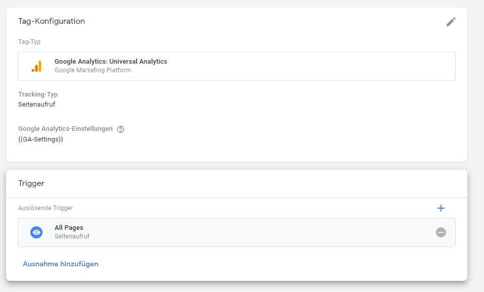 Gehe nun zur Tag-Konfiguration und wähle “Google Analytics: Universal Analytics” aus.