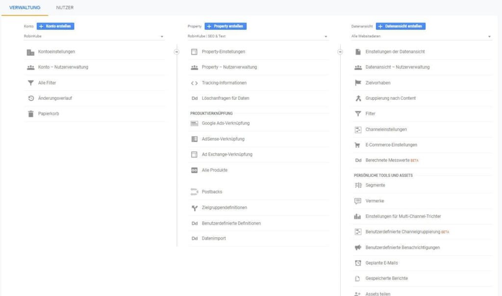 Derartige Definitionen und Einstellungen werden immer über den Reiter “Verwaltung” ganz unten Links bei Google Analytics auf der Startseite vorgenommen.