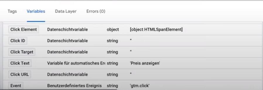 Wählst Du nun “Variables” rechts daneben aus, siehst Du die Werte der Variablen des Klicks.