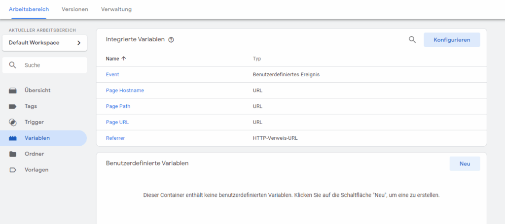 Dafür wählst Du links in der Menü-Leiste “Variablen”. Klicke dann auf “konfigurieren”.