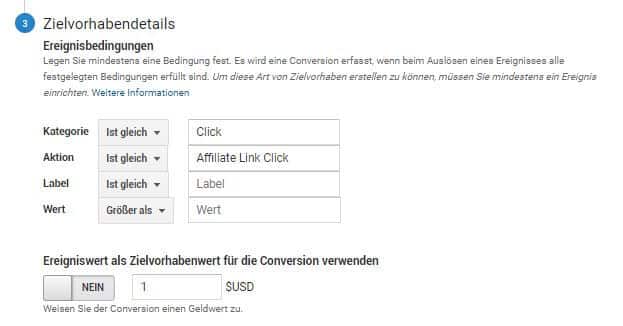 Da wir ja Affiliate Links tracken wollen, wählen wir alle verfügbaren Punkte bei “Klicks” aus.