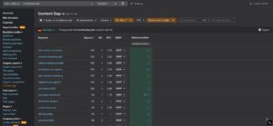 Für trustfactory.de/ zeigt Ahref 74 Keywords an, für die die Website nicht rankt. Das Keyword “B2B Content Marketing” verzeichnet zum Beispiel ein Suchvolumen von 150 und eine Key-Difficulty von 0. Das geringe Suchvolumen und die niedrige Key-Difficulty ermöglicht es uns in diesem Fall, ein hohes Ranking mit diesem Schlüsselbegriff zu erzielen.