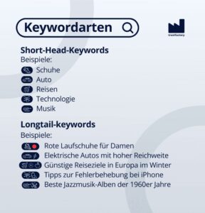 Keywords sind Schlüsselwörter. Short-Head-Keywords umfassen Begriffe, die häufig gesucht werden. Longtail-Keywords dagegen fallen spezifischer aus und werden seltener in der Suchmaske von Google eingegeben.