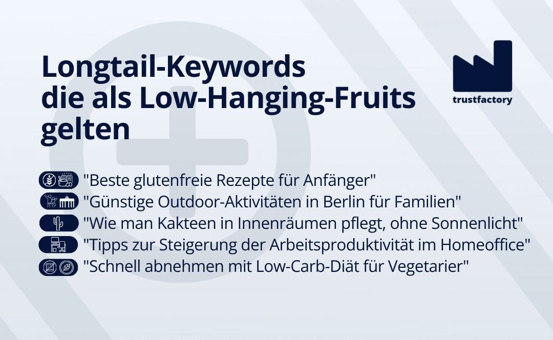 Außerdem definieren SEO-Beauftragte Unique Content, der relevante Keywords enthält und in regelmäßigen Abständen veröffentlicht wird, als Low Hanging Fruits. Die Keywords sollten außerdem wenig Konkurrenz aufweisen.
