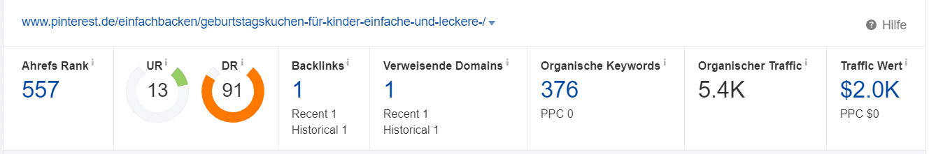 Die Pinnwand “Geburtstagskuchen für Kinder” rankt für 376 Keywords und erhält laut Ahrefs ca. 5.400 Besucher im Monat.