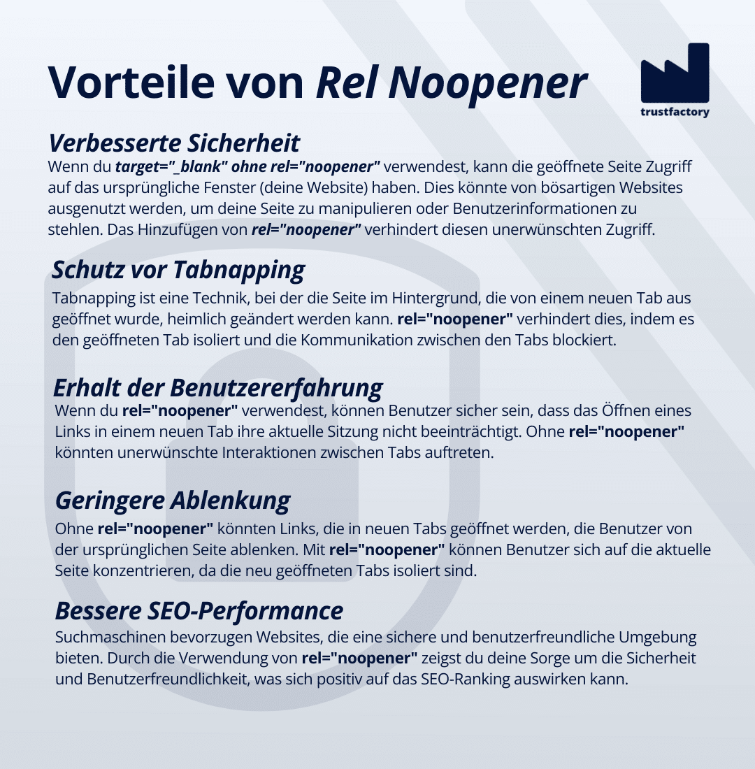 Diese Attribute wurden in erster Linie als effektive Sicherheitsmaßnahme entwickelt, um die Sicherheit Deiner Website zu erhöhen. Mithilfe von JavaScript könnten externe, bösartige Links versuchen, auf digitale Informationen Deiner Besucher zuzugreifen, indem sie in demselben Browserprozess wie Deine Seite laufen. Durch das Hinzufügen von „rel=noopener“ und „rel=noreferrer“ zu Deinen gesetzten Links verhinderst Du also, dass der neue Browser Tab die JavaScript Funktion „window.opener“ nutzen kann, um auf Informationen zuzugreifen.