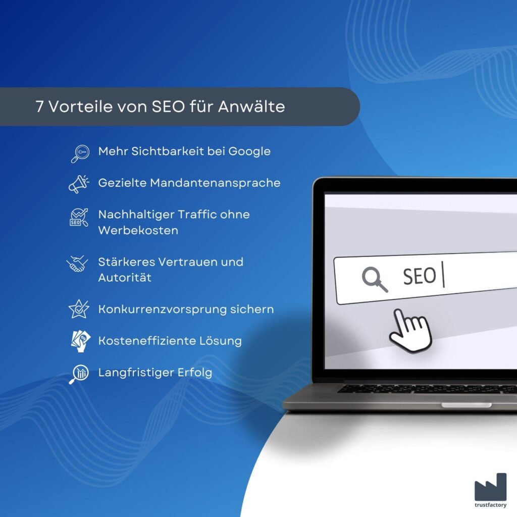 Wenn du unsicher bist, wie du SEO richtig umsetzt, können wir von Trustfactory eine große Hilfe für dich sein. Wir kennen die Besonderheiten von SEO für Anwälte und entwickeln eine maßgeschneiderte Strategie für deine Kanzlei.